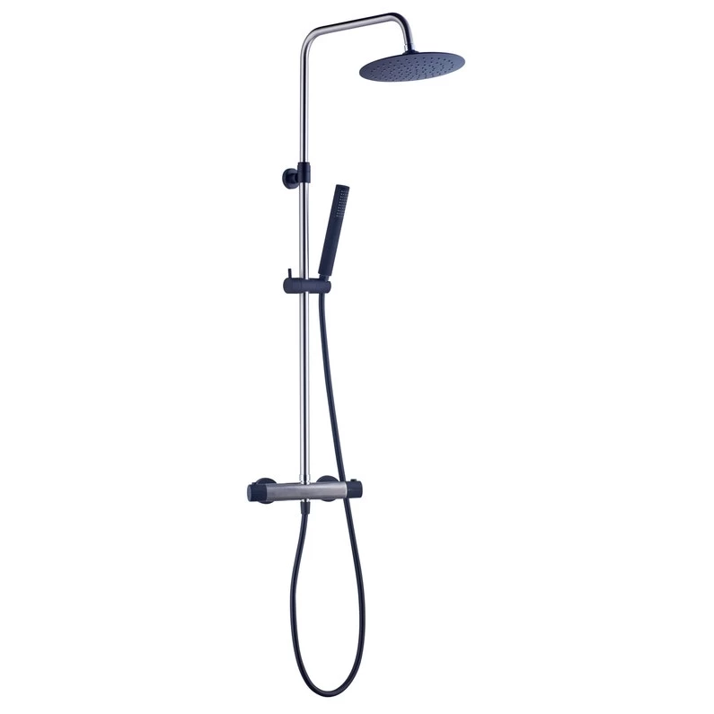 Colonne de douche façon inox et noire Tube rond extensible 780-1140mm Pomme de tête ronde diamètre 23cm en ABS noir Douchette 1 jet tube noire Flexible douche 150cm PVC noir Mitigeur douche mural thermostatique Cartouche de régulation unique Sécurité anti brûlure 38°C Débit tête céramique 1/2 tour Entraxe 150mm double sortie Inverseur intégré dans la manette ouverture/fermeture Support de douchette ajustable Fourni avec raccords excentriques et rosaces