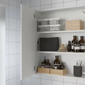 Une porte miroir installée au-dessus de l’élément lavabo facilite la préparation du matin et permet d’agrandir et d’illuminer la pièce. Facile à coordonner avec une porte ou une face de tiroir ENHET et tous les autres meubles que vous possédez déjà .