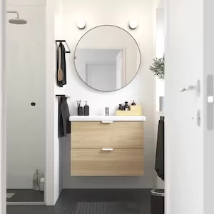 Le plateau et la vasque ronde ont un style simple et épuré, facile à combiner avec d’autres meubles de salle de bain.