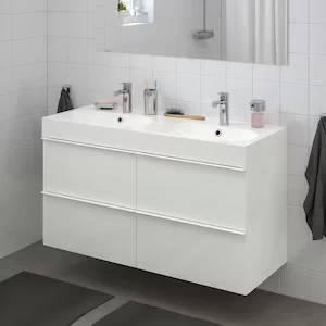 2 vasques, 2 robinets et 4 grands tiroirs. Idéal quand il faut partager la salle de bain.