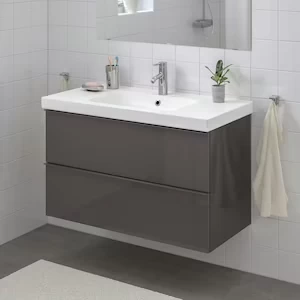 De nombreux rangements et de l’espace sur le plan de travail : une solution idéale pour la salle de bain.