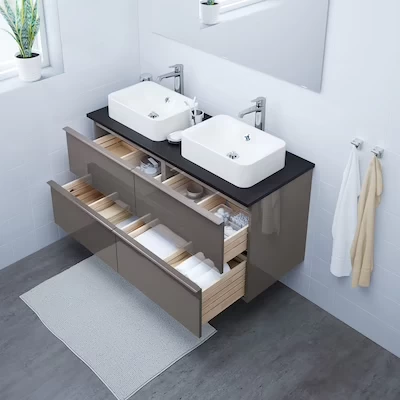 2 vasques, 2 robinets et 4 grands tiroirs. Idéal quand il faut partager la salle de bain.