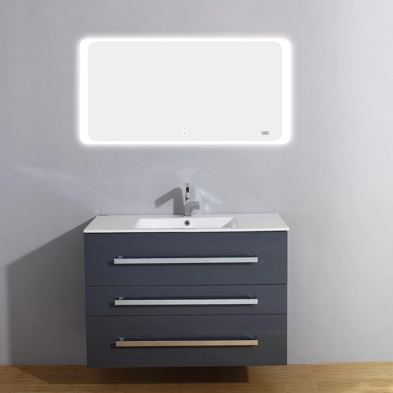 Meuble de salle de bains Senso 100 cm . Plan vasque céramique, panneux et façades en MDF 18 mm. Meuble livré monté à suspendre ou à poser (livré avec 2 pieds), Tiroirs à ouverture total équipés de coulisses soft closing. Miroir LED avec horloge et interrupteur sensitive Touch