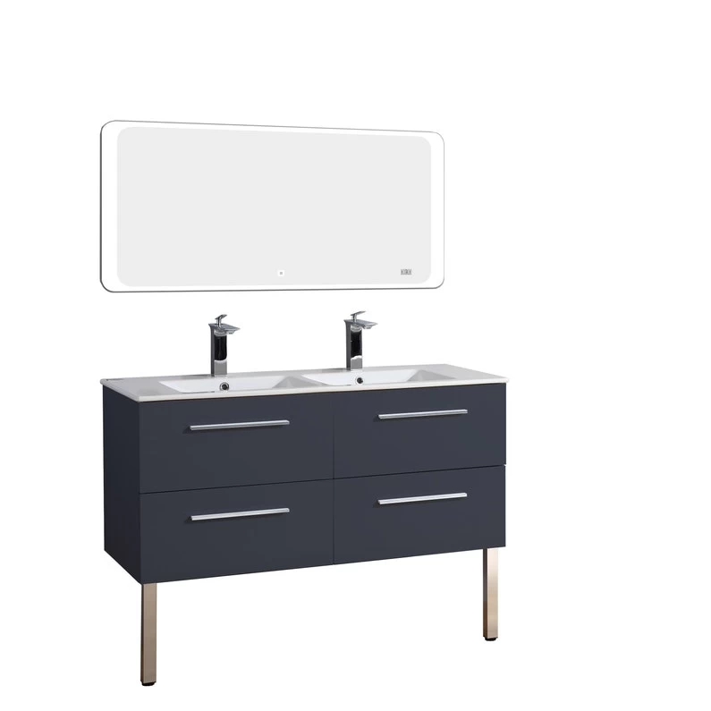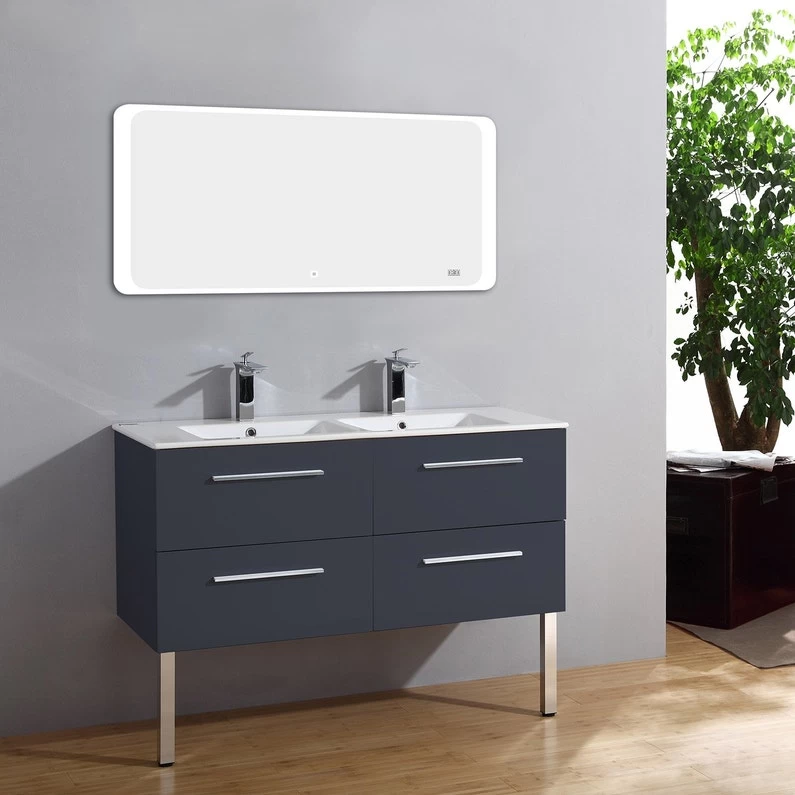 Meuble de salle de bains Kiss 120 cm . Plan vasque céramique, panneux et façades en MDF 18 mm. Meuble livré monté à suspendre ou à poser (livré avec 2 pieds), Tiroirs à ouverture total équipés de coulisses soft closing. Miroir LED avec Horloge et interrupteur sensitive Touch