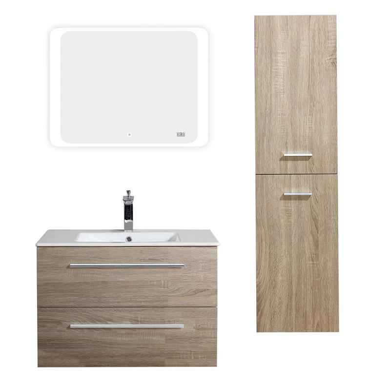 Meuble de salle de bains Kiss 80 cm . Plan vasque céramique, panneux et façades en MDF 18 mm. Meuble livré monté à suspendre ou à poser (livré avec 2 pieds), Tiroirs à ouverture total équipés de coulisses soft closing. Miroir LED avec Horloge et interrupteur sensitive Touch livré avec colonne 2 portes à suspendre