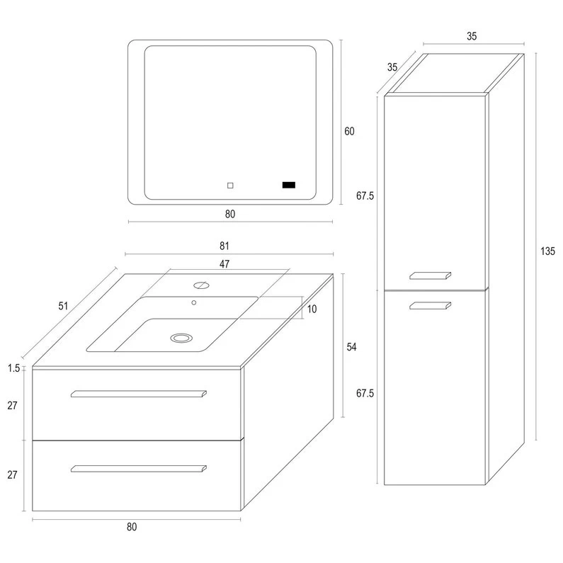| Dimension du meuble sous-vasque (en cm) | L:80cm, Prof:50cm, H:54cm |