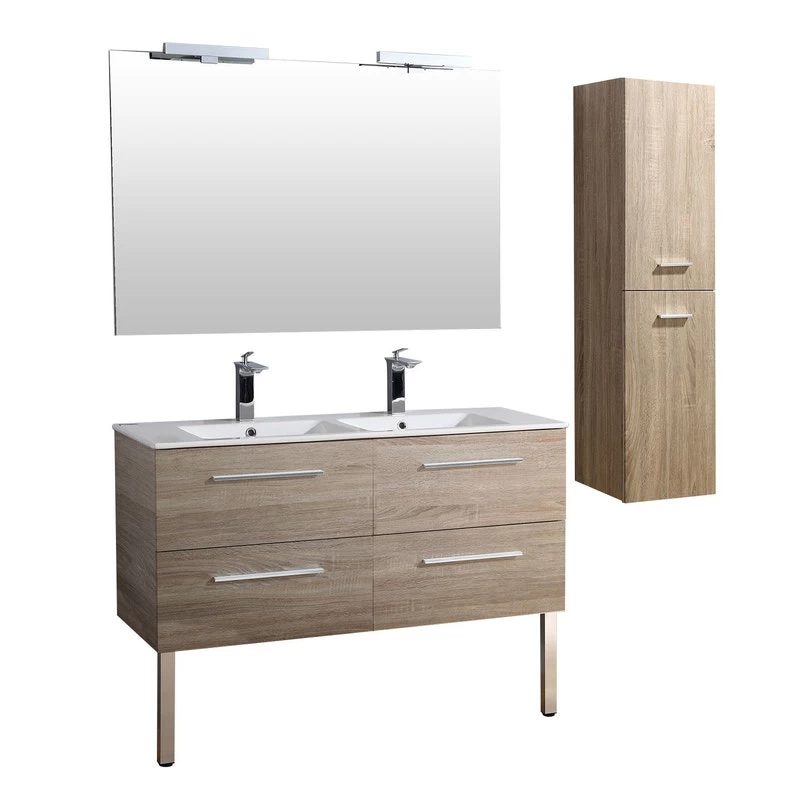 Meuble de salle de bains Kiss 120 cm . Plan vasque céramique, panneux et façades en MDF 18 mm. Meuble livré monté à suspendre ou à poser (livré avec 2 pieds), Tiroirs à ouverture total équipés de coulisses soft closing. Miroir sur panneau bois avec applique halogène. Livré avec colonne 2 portes à suspendre.