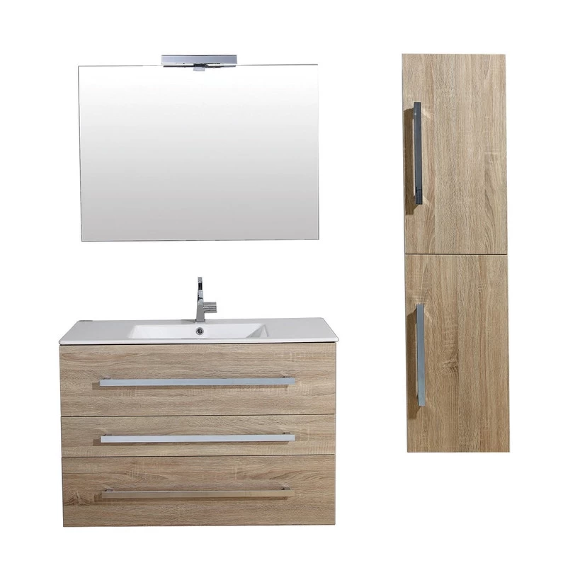 Meuble de salle de bains Senso 100 cm . Plan vasque céramique, panneux et façades en MDF 18 mm. Meuble livré monté à suspendre ou à poser (livré avec 2 pieds), Tiroirs à ouverture total équipés de coulisses soft closing. Miroir sur panneau bois avec applique halogène, livré avec colonne à suspendre 2 portes