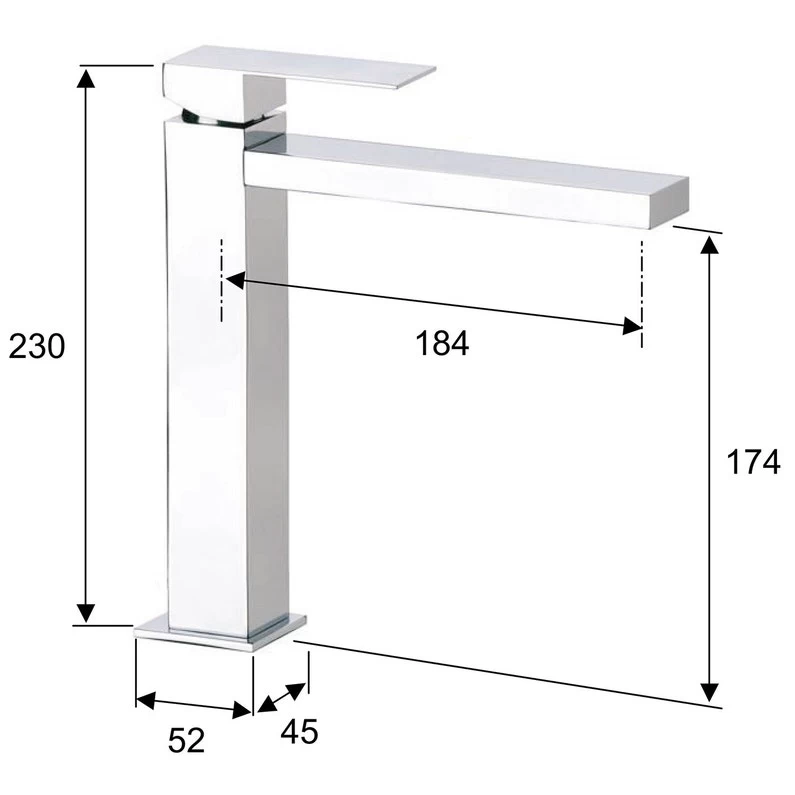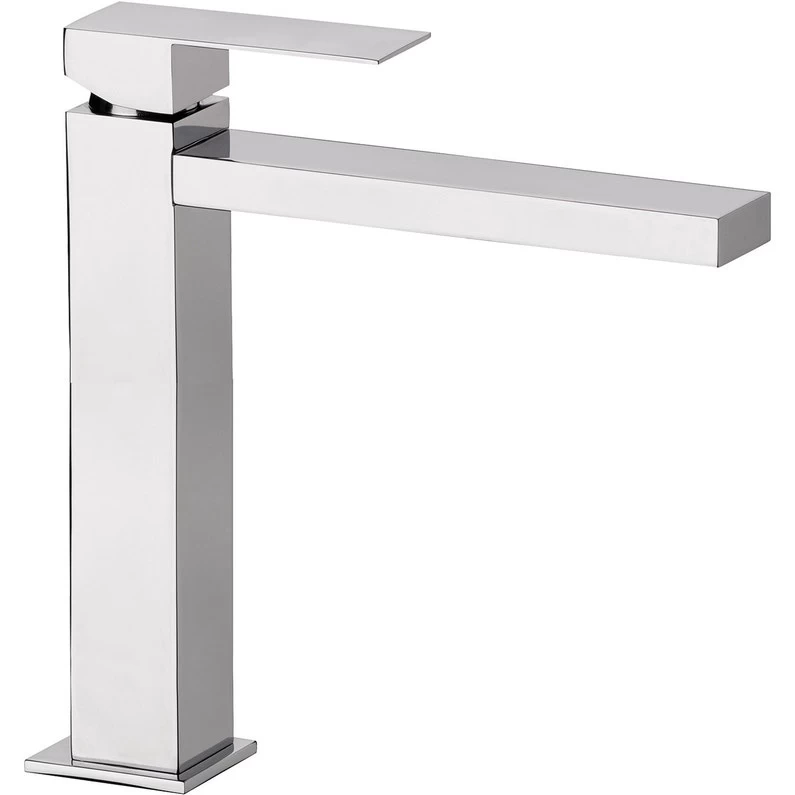 Mitigeur monotrou Lavabo haut carré équipé d’une cartouche à disques céramiques diam 25, manette métal, alimentation par flexibles inox M12/100 x F12/17 longueur 35 cm, fourni sans vidage, hauteur totale 230mm, sous bec 174mm, saillie 184mm, chromé.
