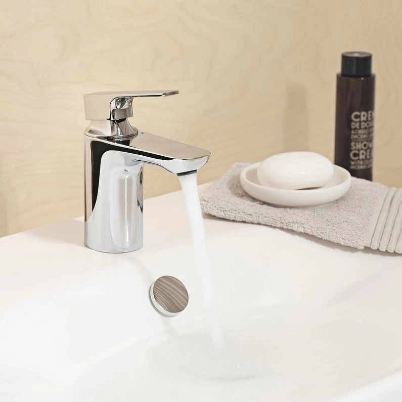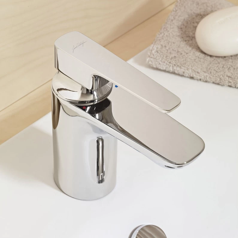 Mitigeur lavabo avec flexibles d’alimentation tournants. Bague-limiteur de température. Aérateur anti-calcaire. Corps froid. Tirette latérale. Bonde de vidage en métal. Débit limité à 5 l/mn.