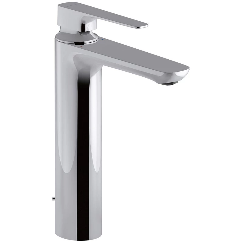 Mitigeur lavabo – modèle haut – avec flexibles d’alimentation tournants. Bague-limiteur de température. Aérateur anti-calcaire. Tirette latérale. Bonde de vidage en métal. Débit limité à 5 l/mn.