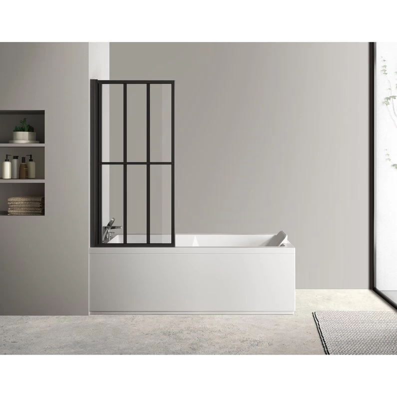 LIFT “Atelier” pare-baignoire 1 volet pivotant et relevable au-dessus de la baignoire – 140 x 71 cms – Finition noir mat – Verre clair 3 mm – Barettes alumininium – 1 poignée porte serviettes