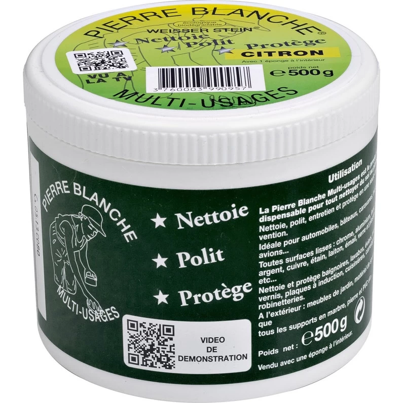 Véritable Pierre Blanche, produit biodégradable multi usage, non toxique. Parfum Citron. Eponge fournie. La Pierre Blanche nettoie, polit et protège. Usage intérieur et extérieur