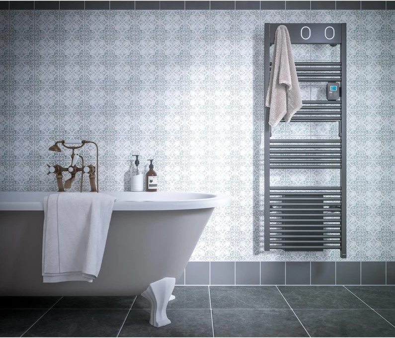 Radiateur sèche- serviettes fluide, triple confort système 3CS, chaleur enveloppante et constante. 4 accessoires malins fournis (3 patères et 1 barre rétractable). Jusqu’à 25% d’économies grâce à la régulation électronique et la programmation libre. Boîtier de commande facile d’accès et d’utilisation avec affichage de l’heure, avec fonction séchage du linge. Installation facilitée grâce au gabarit de pose inclus dans l’emballage. S’adapte aux imprévus grâce à la fonction Boost en accès direct pour une salle de bains chaude rapidement.